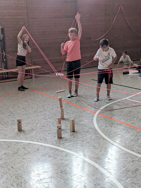 Beim Team-Tower-Spiel mussten mit Hilfe einer Hebevorrichtung, die von mehreren Kindern über Seile gehalten und bewegt werden konnte, gemeinsam Türme gebaut werden.