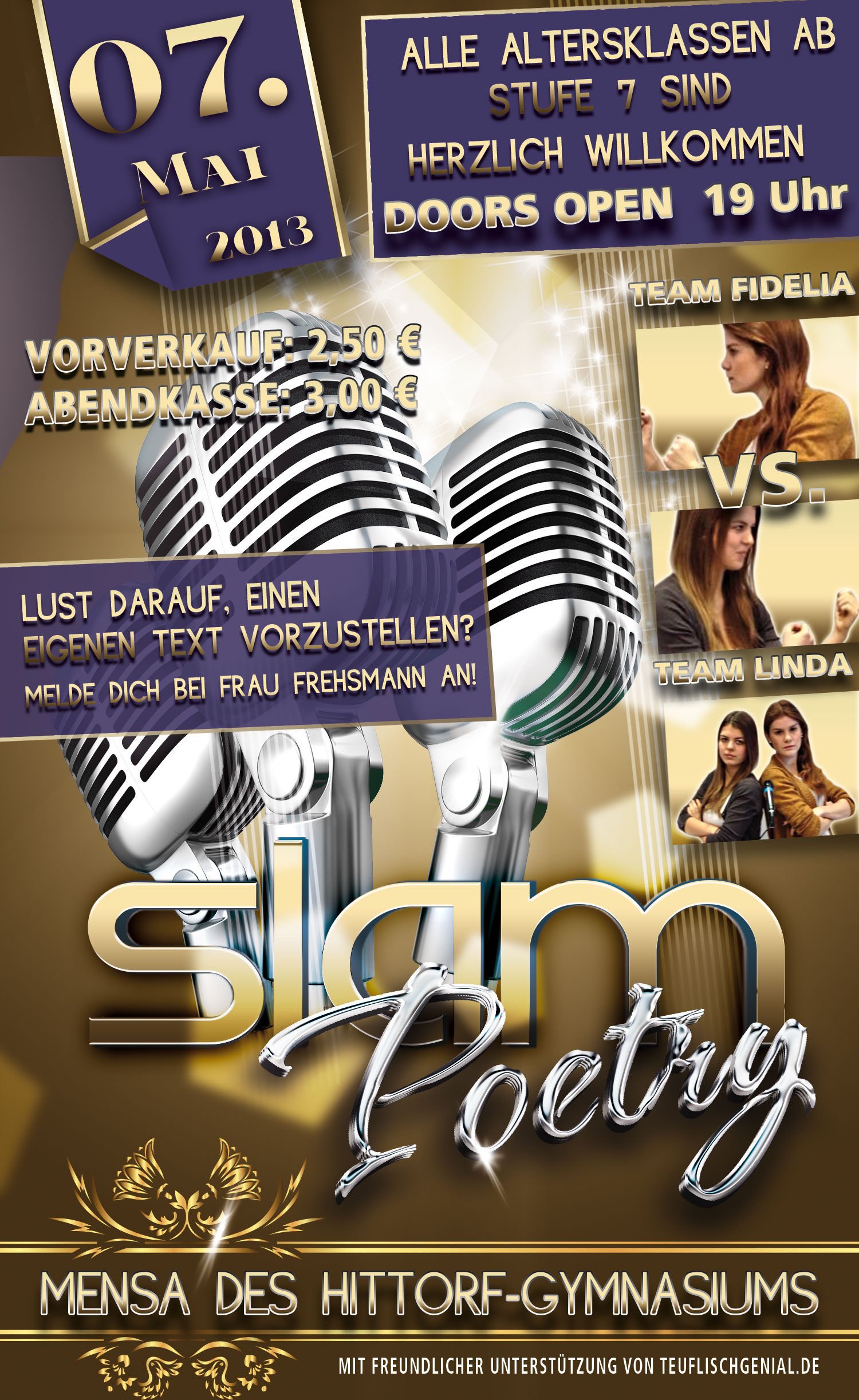 Die Teilnehmer des Literaturkurses der Q1 von Frau Frehsmann veranstalten am Dienstag, dem 07. Mai 2013 um 19 Uhr einen Poetry Slam, also einen Wettstreit von Autoren und Dichtern. Dort werden Schüler, Lehrer und andere Hobbypoeten ihre selbstverfassten Texte und Gedichte vorstellen. Eine Jury und das Publikum bewerten den Auftritt und küren den Sieger. Alle, die Interesse haben, dieses Spektakel live mitzuerleben oder sogar aktiv mitzugestalten, sind herzlich eingeladen! Karten werden für 2,50 € im Vorverkauf und für 3 € an der Abendkasse angeboten. Für leckeres Essen und ausreichend Getränke ist gesorgt! Also kommen Sie vorbei und slammen Sie mit!