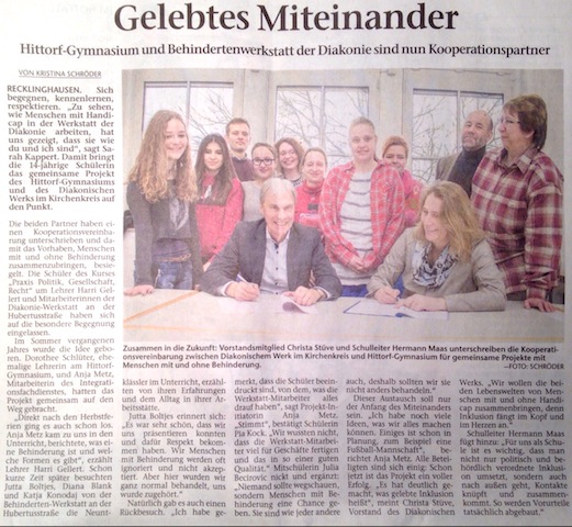 Eine langfristige, dauerhafte Planung und Durchführung von gemeinsamen Projekten ist das Ziel des Kooperationsvertrages zwischen dem Hittorf-Gymnasium und dem Diakonischen Werk. Diese Vereinbarung wurde am 14. Januar 2016 im Hittorf von unserem Schulleiter Herrn Maas und Frau Stüve, Vorstandsmitglied des Diakonischen Werks, unterschrieben.