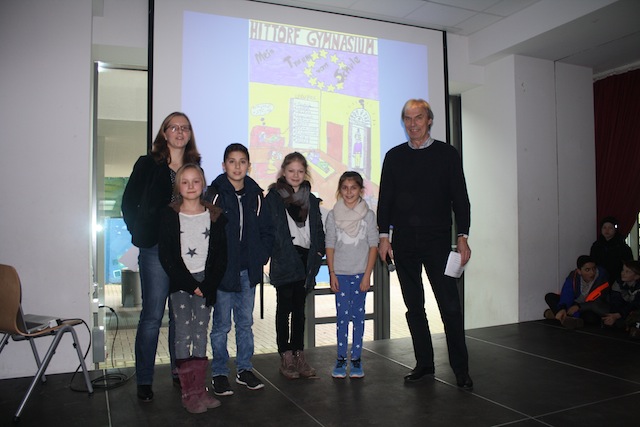 Die Arbeiten von Lydia Walther (5c), Elma Kamic (5d), Laura Moor (5e), Alper Delibas (6d) und Anna-Sophie Breidenstein (7a) (nicht auf dem Foto) werden die Titelbilder des Hittorf-Timers für das kommende Schuljahr 2015/2016 schmücken.