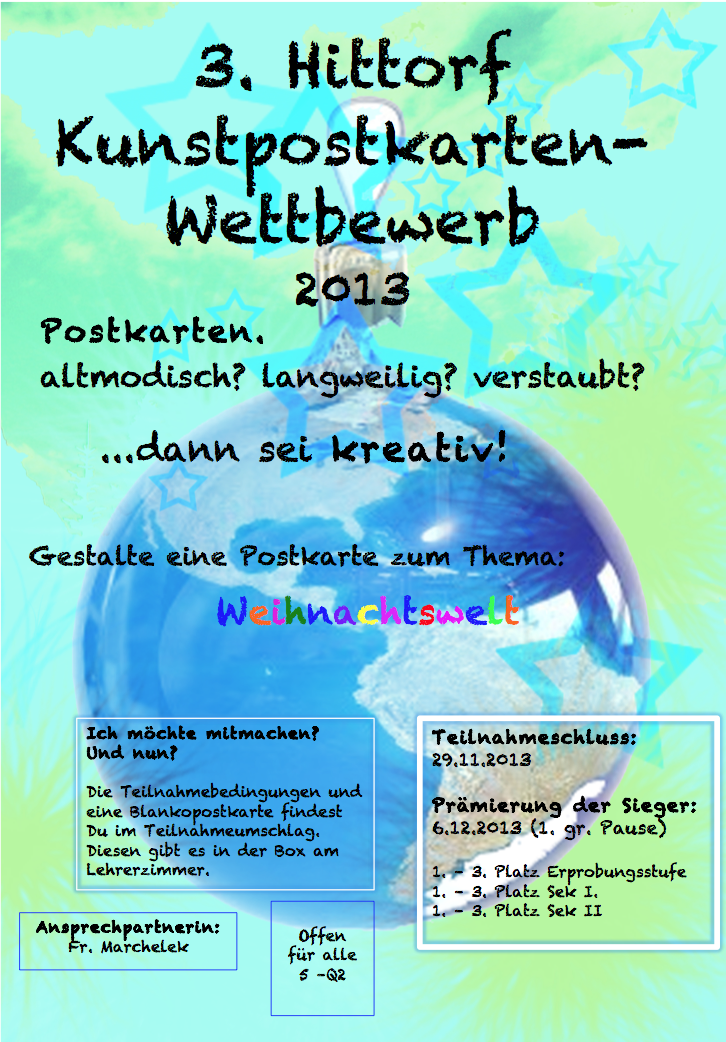 Dann sei kreativ und gestalte deine Kunstpostkarte zum Thema: Weihnachtswelt als Wettbewerbsbeitrag für den Hittorf-Kunstpostkartenwettbwerb 2013.