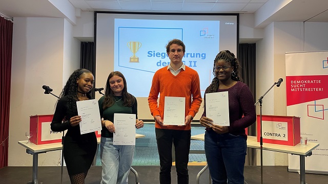 Von links nach rechts: Tlhonolofatso Vahlhaus (Pro 1), Hannah Fron (Pro 2), Paul Julius Golm (Contra 1), Cheryl Agyemang-Duah (Contra 2)