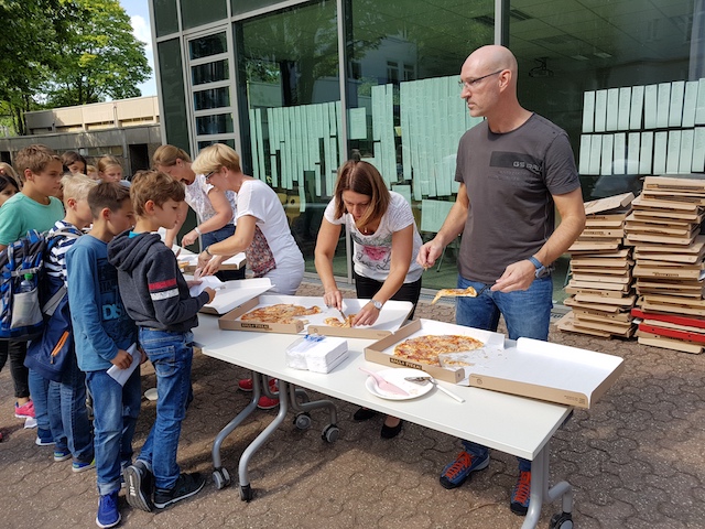 Da unser Bistro nicht die Kapazitäten für eine Vollversorgung hat, bitten wir gemeinsam mit allen betroffenen Schulen die Eltern ganz herzlich den Kindern in den kommenden Tagen Verpflegung mit in die Schule zu geben; eine zweite „Pizza-Party“ wird es leider nicht geben…