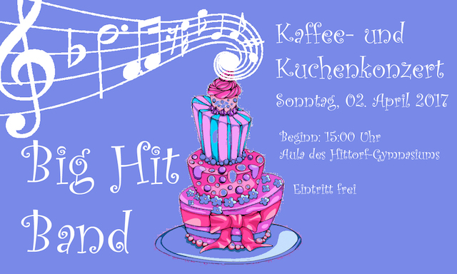 Das diesjährige Kaffee- und Kuchenkonzert der Big Hit Band des Hittorf-Gymnasiums findet am Sonntag, dem 2. April 2017, von 15 bis 17 Uhr in der Aula statt. Für das leibliche Wohl ist natürlich gesorgt.