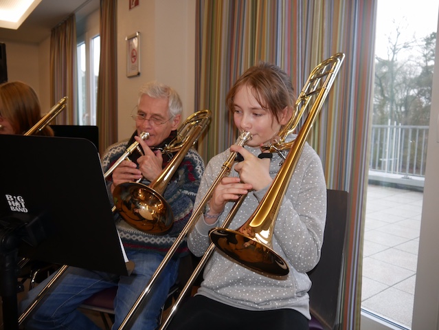 Am dritten und letzten Tag wurde morgens noch kräftig für die CD in der „Kleeblattformation“ geprobt. Danach wurden die Zimmer geräumt, die Instrumente eingepackt und der Raum wieder aufgeräumt. Um 13 Uhr fuhren dann die meisten zum Hittorf-Gymnasium um die Sachen aus zu laden. Ein paar der Big Band Mitglieder sind schon etwas länger nicht mehr auf dem Hittorf, aber kommen trotzdem zu manchen Proben, wie Julian Hugo, Lara Lechtenfeld und Jannik Fresmann.