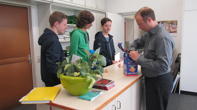 Herr Dr. Jentsch nahm diesen Erfolg zum Anlass, den Dreien persönlich zu gratulieren, sich von der ersten Runde berichten zu lassen, sich mit den Schülern über die Aufgaben auszutauschen und sie mit Gummibärchen in mathematisch äußerst interessanten Verpackungen zu beschenken.