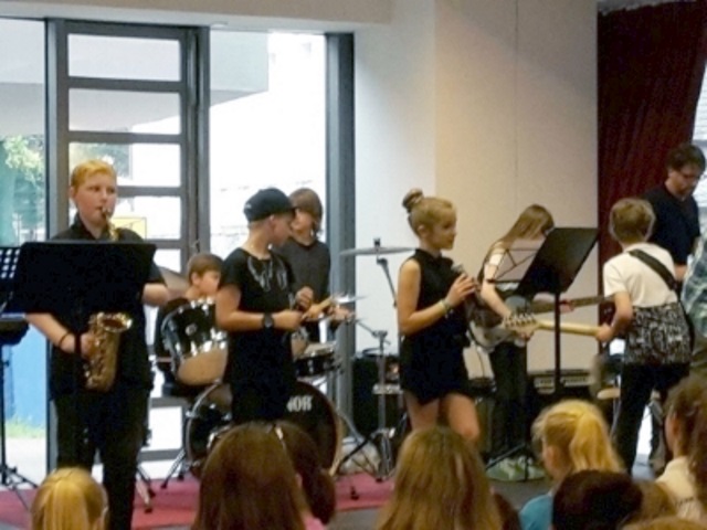 Nicht nur die Interpretation des Liedes Celebration unserer neuen Saxophonisten sorgte für tosenden Applaus. Die Schülerinnen und Schüler der Klassen 5a bis 5e präsentierten ihren Familien und Freunden am 02.06. ein abwechslungsreiches Programm, dem auch die starken Regenfälle nichts anhaben konnten.