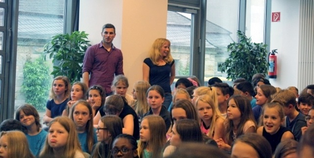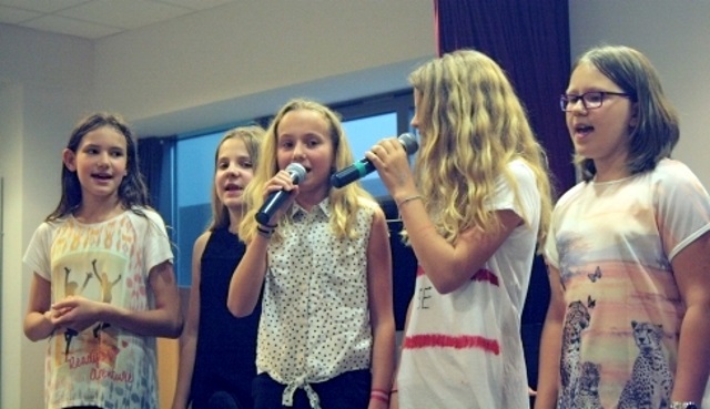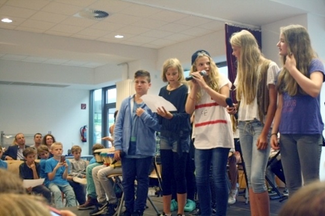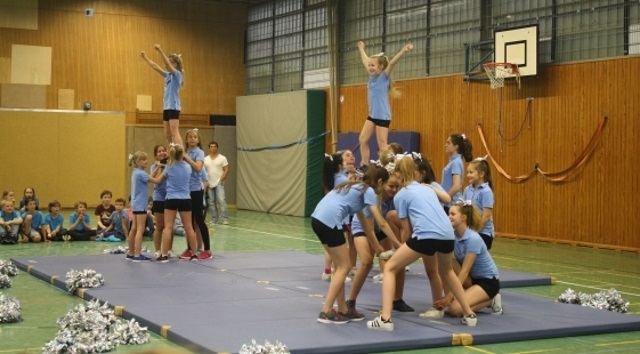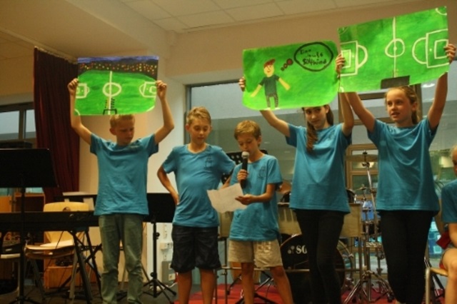 Den Auftakt machten die Cheerleader mit einer beeindruckenden Performance in der Turnhalle. Der Unterstufenchor, die Band One to One sowie zahlreiche Klassenhits sorgten für musikalische Unterhaltung, während die Nachwuchsschriftsteller/-innen der Klasse 5d ihre Zuschauer in den Bann des Tornados zogen. Ein weiteres Highlight setzte die Klasse 5c mit einem Kooperationsprojekt der Fächer Deutsch, Englisch und Kunst. Angelehnt an mittelalterliche Bänkelgesänge präsentierten sie selbstverfasste Gedichte in deutscher und englischer Sprache, die sie mit selbstgemalten Bildern visualisierten.
