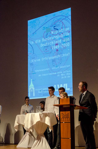 An einem ungewöhnlichen Ort – über den Dächern des Hittorfs – zeichnete Herr Dr. Jentsch die Teilnehmer des diesjährigen Türmchengesprächs aus. Die insgesamt acht Schülerinnen und Schüler hatten am 10. März 2016 im LWL-Industriemuseum Zeche Zollern in Dortmund zum aktuellen Thema „Migration in die BRD - (k)eine Erfolgsgeschichte?“ debattiert und konnten dabei das Publikum mit treffsicheren Argumenten und viel Freude an der Diskussion begeistern.