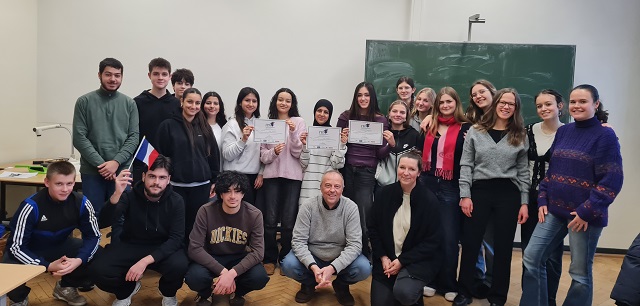 Am 22.01.2025 nahmen die Klassen 10a und 9a sowie die Grundkurse Französisch der Jahrgangsstufen EF und Q2 am Internetteamwettbewerb teil, an dem sich 3350 Gruppen und mehr als 56.000 Schüler:innen deutschlandweit beteiligten. Herr Dr. Jentsch übergab den Kursen und Klassen die Teilnahmeurkunden und gratulierte