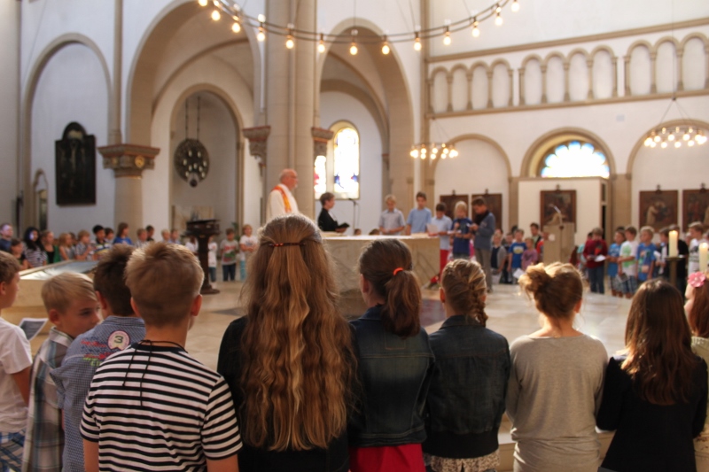 Los ging es mit einem ökumenischen Gottesdienst in der Paulus-Kirche, der unter dem Motto „Gemeinsam leben & lernen“ stattfand und bei dem nicht nur gepredigt, gebetet und gesungen wurde. Schülerinnen und Schüler des jetzigen Jahrgangs 6 erinnerten sich an ihre Wünsche und Bedenken bei der Einschulung in die weiterführende Schule, warfen einen Blick auf ihr erstes Jahr am Hittorf, erklärten, was es bedeutet, gemeinsam dort zu leben und zu lernen, und machten den neuen Schülerinnen und Schüler Mut für die kommende Schulzeit.