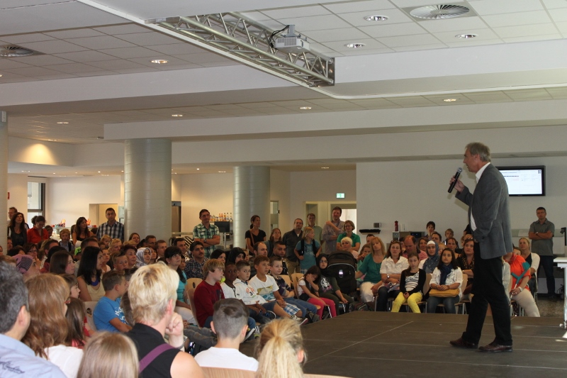 Weiter ging es in der Aula der Schule mit der Begrüßung durch den Schulleiter Herr Maas, der unsere 5. Klässler noch einmal persönlich willkommen hieß und Frau Schlüter als Zuständige für die Koordination des Bereichs „Ganztag“ sowie Frau Bloedorn als zuständige Stufenleiterin vorstellte. Ebenso wurden die Gäste mit dem nichtpädagogischen Personal der Mensa, Frau Baller und Frau Tekautschitz, bekannt gemacht.