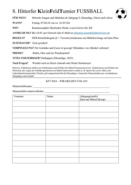 sebastian.amendt@hittorf-iserv.de mit dem Betreff „Kleinfeldturnier Fußball 2024“ und den Angaben zu Mannschaftsnamen, Spielernamen und Hittorf-Zugehörigkeit.