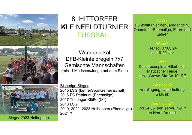 Anfang Juni wird das Kleinfeldturnier Fußball des Hittorf-Gymnasiums in diesem Jahr bereits zum achten Mal stattfinden. Mädchen und Jungen der Jahrgänge 9 bis zur Q2 treten in selbst erstellten Mannschaften gegen Ehemalige und die LehrerSportGemeinschaft (LSG) an. Auf die erste Eltern-Auswahl warten die Turnierorganisatoren bislang noch und würden sich über eine Turnierteilnahme freuen. Der Spielort hat sich bewährt, sodass das runde Leder wieder an der Sportanlage Maybacher Heide in Recklinghausen rollt. Zuverlässig wie eh und je wird dort auch dank des FC/JS Hillerheide für Speisen und Getränke gesorgt sein, sodass auch die zahlreichen Zuschauer auf ihre Kosten kommen können.