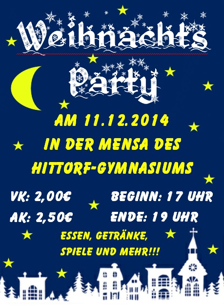 In der Mensa des Hittorf-Gymnasiums steigt am 11.12.2014 die Weihnachtsparty der SV. Los geht es um 17 Uhr. Karten gibt es im Vorverkauf für 2 Euro und an der Abendkasse für 2,50 Euro. Die SV freut sich auf zahlreiche Gäste.