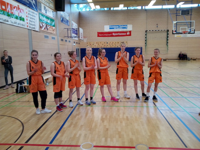 Also machten sich die Hittorferinnen an die Arbeit. Das erste Viertel gewann man knapp mit 11:8. Zur Halbzeit sah es schon etwas besser aus, 5 Punkte Vorsprung und noch viel Potenzial nach oben. In der Verteidigung lief es überraschend gut, lediglich im Abschluss „fielen“ die Bälle immer wieder aus dem Korb. Angetrieben von Lilly Kaprolat und Svenja Sagasser wuchsen die Mädels über sich hinaus. Nun trafen auch Nina Swiatkowiak und Tanja Srejic, in der Verteidigung glänzten Sydney Schulz und Charlotte Körner, unterstützt wurden sie von Anna Breidenstein und Patricia Braun.