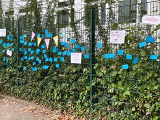 Am 21. September 2021, dem Welttag der Dankbarkeit, haben Schülerinnen und Schüler sowie Lehrerinnen und Lehrer besonders an all die Menschen, Tiere, Dinge und Erlebnisse gedacht, für die sie dankbar sind. Sie haben dies in Form kleiner Zettel schriftlich festgehalten und auf dem Schulhof ausgestellt. Es ist schön zu sehen, wie viel Schönes und Aufmunterndes wir alle in unserem Leben haben.