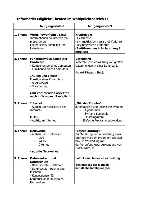 Im Informatikunterricht des Wahlpflichtbereiches werden grundlegende Kompetenzen im Umgang mit den Anwendungssystemen und dem Internet erworben. Die Auswirkungen der Datenverarbeitung auf die Gesellschaft (einschließlich der Datenschutzproblematik) finden ebenso ihren Platz wie der funktionelle Aufbau der Hardware eines PC´s. Auch den Schülerinnen und Schülern eher unbekannte Themen wie beispielsweise Datenverschlüsselung, Netzwerkstrukturen, digitale Schaltungen, Simulation & Modellbildung, Programmierung und Datenbanken werden behandelt.