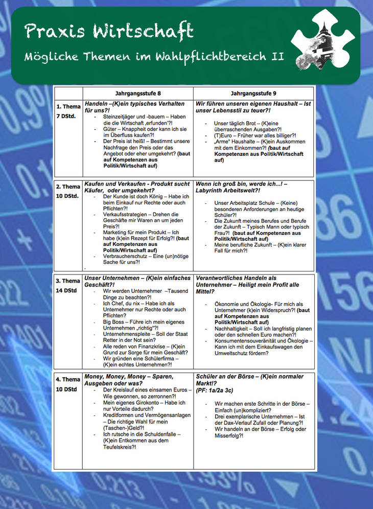 Ein Praxis-Wirtschaftskurs setzt die Tradition der Politik/Wirtschaftskurse aus dem früheren Differenzierungsbereich fort jedoch mit verändertem Schwerpunkt; denn in diesem Kurs werden betriebswirtschaftliche Problemstellungen stärker in den Vordergrund gerückt. Der Zusatz Praxis betont die Schüler- und Handlungsorientierung, die bei der Ausgestaltung der Themen des schulinternen Curriculums eine wichtige Rolle spielten. Die Lernenden erhalten die Gelegenheit, einerseits Wirtschaft zu erleben z.B. durch regelmäßige Praxiskontakte in Form von Betriebserkundungen oder Expertengesprächen, andererseits sollen die Schülerinnen und Schüler selbst aktiv handeln, indem verstärkt handlungsorientierte Methoden verwendet werden, wie z.B. Rollenspiele, Debatten, Zukunftswerkstätten, Simulationsspiele etc. mit dem Ziel, die ökonomische Urteilsfähigkeit sowie Handlungskompetenz zu fördern.