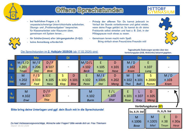 Die Offenen Sprechstunden für das 2. Halbjahr 2025/26 sind: